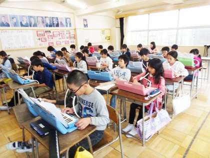 リズムを合わせて、けん盤ハーモニカを演奏していました。