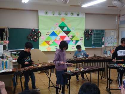 今日は、クリスマスお楽しみ会の日でした。これまで練習してきた鉄琴や木琴を使った合奏やハンドベルの演奏、劇の発表をし、お箸を使ったゲームもしました。劇では、リコーダーで演奏できるようになった曲を演奏したり、家庭科で作った作品を披露しました。たくさんの人に参観していただくことができ、子どもたちの心に残る楽しい一日になりました。