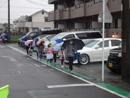 子どもたちは、傘をさして一列で元気に登校してきています。