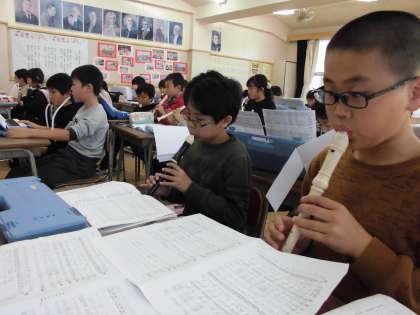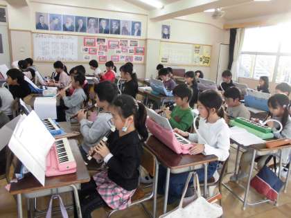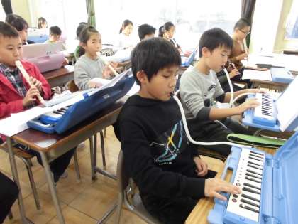 音楽で合奏の練習をしています。曲名は、「ビリーヴ」です。まずは、鍵盤とリコーダーの練習から始めています。3学期に入ったら、木琴や鉄琴、打楽器も加えて練習します。学年で心を1つに合奏をつくり上げていきます。