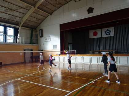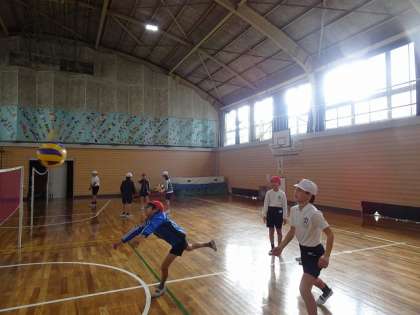 5年生の体育では、屋内運動場でビーチボールバレーを行っていました。