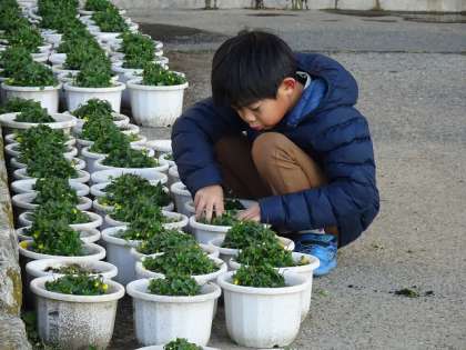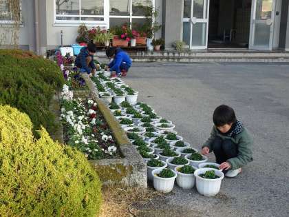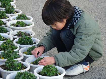 3年生の子どもたちが、鉢の花を黙々と摘んでいました。