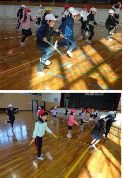 始めは少し寒かったようでしたが、体が温かくなり、防寒具を脱ぐ子も多くなりました。