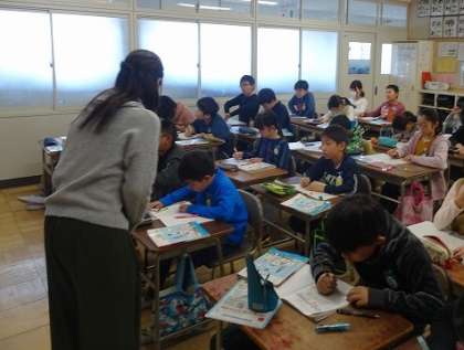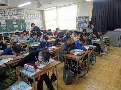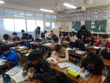 1クラスに2人の先生が指導にあたるチーム・ティーチングで、授業が進められていました。割合の学習をしていました。先生方からアドバイスを受けながら、一生懸命に取り組んでいました。