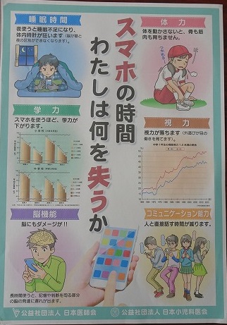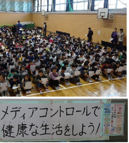 さて、2日前の土曜日から今週の金曜日まで、末広小、神山小、中部中学校の3つの学校で、「あったか家族週間」に取り組んでいます。みなさんは「あったかすえまる君カード」を使って、取り組んでいますね。私たちの周りにはテレビ、ゲーム、スマホなどの電子機器がたくさんあります。それらをまとめて、メディアと言います。それらは、楽しんだり、連絡することができたりして便利ですが、上手に付き合わないといろいろな面でよくないことが出てきます。このことについて、プリントを使って確認したいと思います。「日本医師会」というお医者さんの会に許可をいただきましたので、配っていただきます。