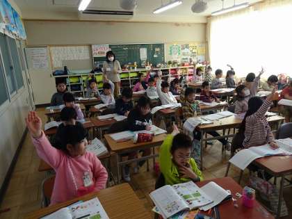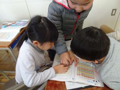 1から100まで、順序よく並んだ表に、「ねずみ」や「ねこ」のイラストの紙を置いて、隠れた数字を、近くの友だちと答え合っていました。楽しそうに学んでいました。