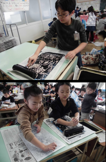 図工で、木版画を行っています。2学期から少しずつ取り組んできた作品がいよいよ完成に近付いてきました。彫りあがった人から版を刷り、この後、絵の具で着色していきます。刷り上がった作品を見て、「おぉ、、、上手くできてる〜」とすごく嬉しそうにしていました。