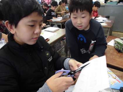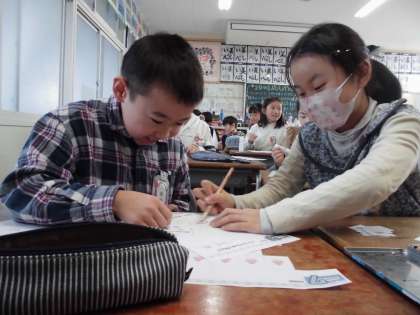 英語活動がありました。「What do you want?」の会話文を使って、ペアでパフェ作りをしました。それぞれのカップに「入れたいな」と思うフルーツを数まで指定して要求し、ペアの定員さんから受け取り、オリジナルパフェを作りました。
