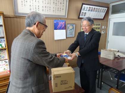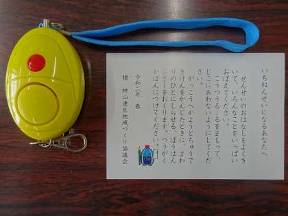 会長様から、昨年度に引き続き、新1年生への防犯ベルがメッセージとともに寄贈されました。