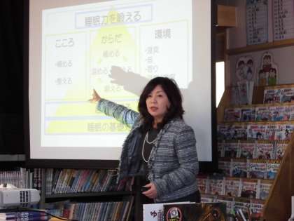 日本快眠協会代表理事、今枝昌子先生の講演「眠育 子どものねむりと親のねむり」(学校保健委員会主催)が開かれ、PTAの皆さんが参加しました。子どもたちの睡眠の現状や睡眠の基礎知識を学んだ後、足裏快眠法の実技講習を受けました。スーパーボールで足の裏を押すと心地良い痛みがあり、足が温まるようでした。体がリラックスし、質の高い睡眠に効果があるそうです。早速今日の夜から試してみたいと思います。
