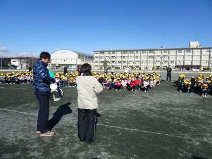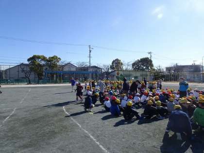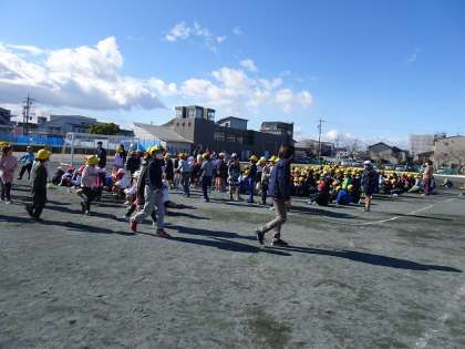リズムなわとびを行っている最中に、避難指示の放送で避難する訓練を行いました。