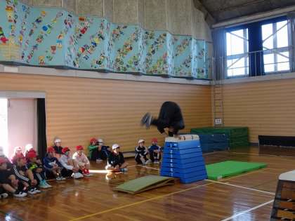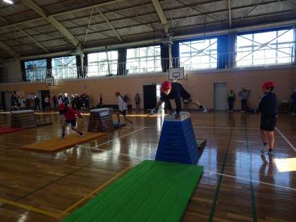 いろいろな跳び方や台上前転などの技に挑戦していました。