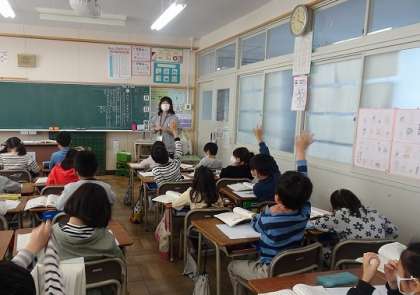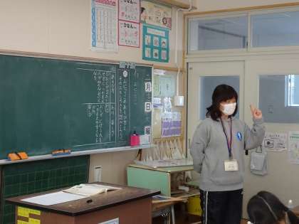 「おにごっこのあそび方とそのおもしろさを読みとろう」というめあてで、授業が行われていました。先生の話をよく聞いて、進んで発言していました。