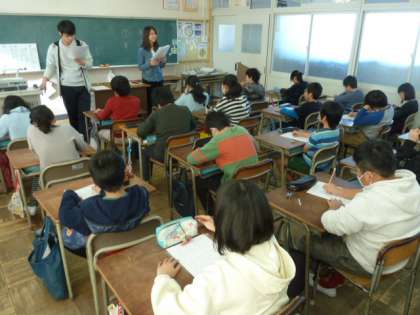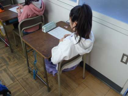 4年生の英語活動のまとめとして、「英語にチャレンジ」を行いました。担任の先生の質問内容を、ALTが英語で伝え、どれが正しいかを問う問題を行っていました。