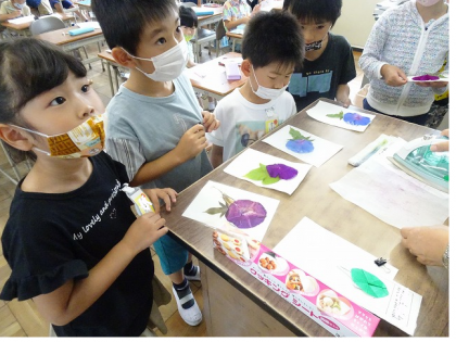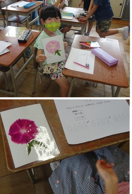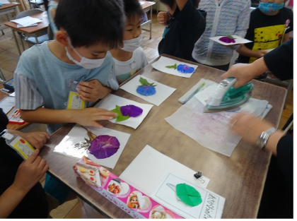 1年生では、育てているアサガオの花を使って、しおり作りが行われていました。