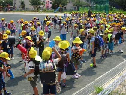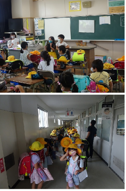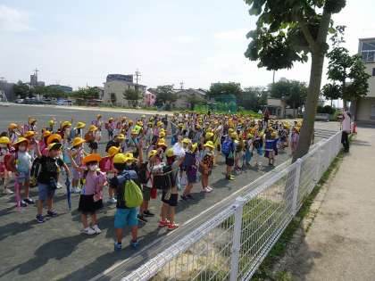 「帰りの会」の後、廊下に並んで、担任の先生の引率で、運動場に出て、分団ごとに並びます。