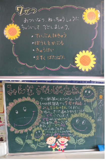 各学級の後ろの黒板には、担任の先生からの子どもたちへのメッセージが書かれています。