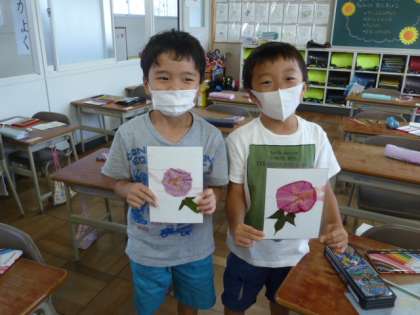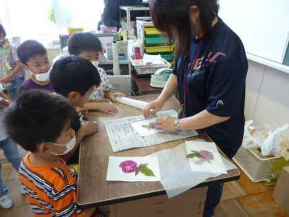 自分たちが育てたアサガオの花びらをつんで、押し花を作りました。先生がアイロンを使って平らにし、ラミネートをかけて完成です。いろいろな色で、すてきな押し花ができました。