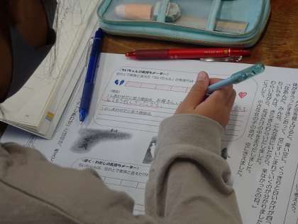 そして、みんなでキーワードとなる部分を確認し、ワークシートには各自が心情メーターに考えを示し、理由をしっかり考えて書いていました。