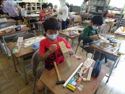 「ギコギコトントン」というテーマで、「のこぎり」と「かなづち」を使って、木材を使って、作品作りをしていました。