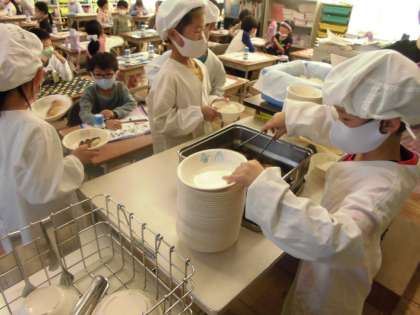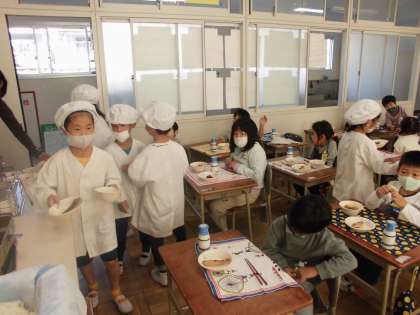 給食当番頑張っています。こぼさないように、ていねいにおかずをつけ分けてることができるようになってきました。また、安全に気をつけて配膳しています。みんな意欲的に当番活動に取り組んでいます。