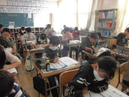 10月23日(金)書写の授業 【6年生】 公開日 2020/10/25 更新日 2020/10/25 6年 書写の授業で、小筆の筆使いに気を付けながら松尾芭蕉の俳句を書きました。みんなすごい集中力で黙々と取り組んでいました。