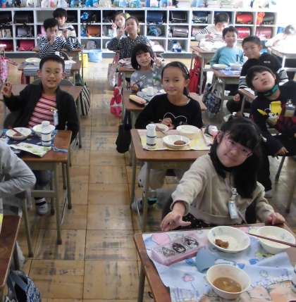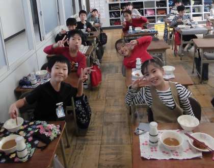 今日の大きいおかずは「秋の味覚汁」でした。さつまいもやきのこ、ごぼうなどの秋ならではの食材がたくさん入っていて、子どもたちはおいしそうに食べていました。
