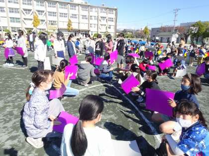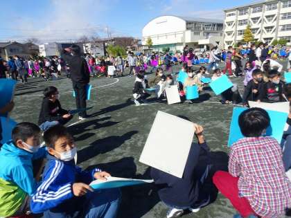 末広小学校の上空に、飛行機が飛んできて、かけ声に合わせて、みんなで動きを止めて撮影しました。