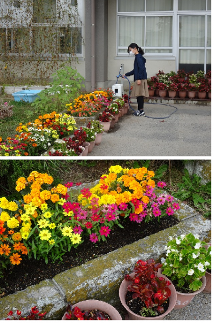 委員会や係の子どもたちが、花や野菜の水やりをしています。
