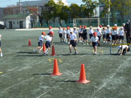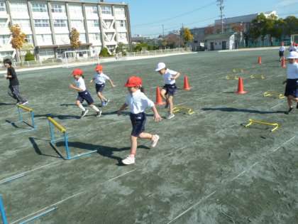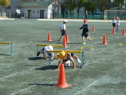 体育の時間、いろいろな障害物を使って、走りました。コーンの周りをまわったり、両足ジャンプしたり、ハードルをくぐったりしながらゴールめざして走り抜けました。とても楽しそうに運動していました。