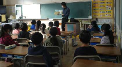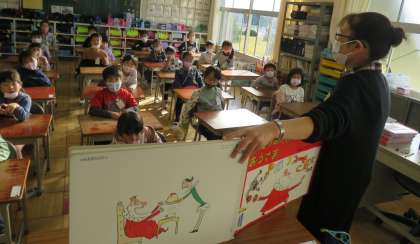 今日は担任の先生ではなく、「先生シャッフル」で本の読み聞かせが行われました。児童たちは、直前までどの先生が来るのか知らず、どきどきわくわくして待っていました。