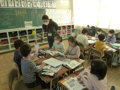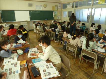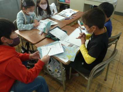 社会の時間、交通事故を防ぐための施設について、調べたことをグループで確認しながらプリントにまとめました。ホワイトボードにまとめ、発表の準備をしていました。