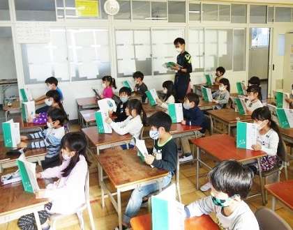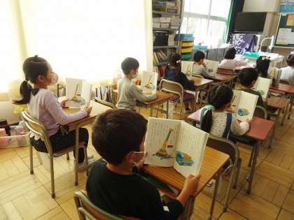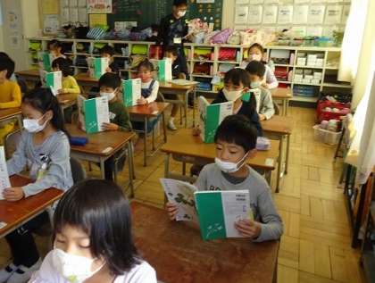 1年生の国語の授業では、姿勢に注意しながら、みんなで声をそろえて、教科書を読んでいました。
