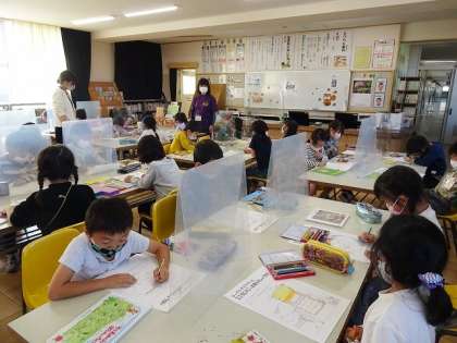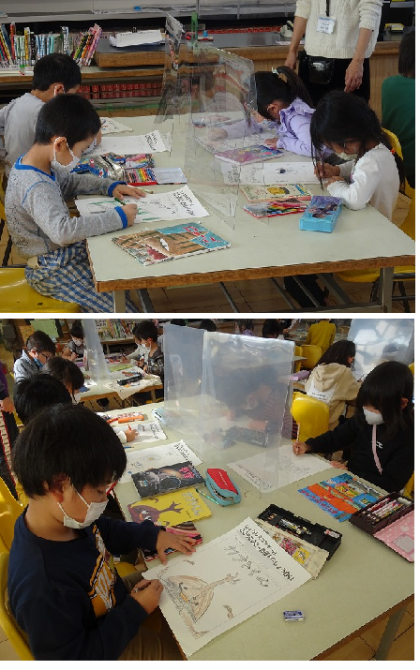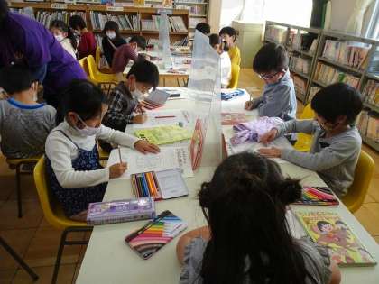 1年生が、図書館で表紙絵コンクールの作品づくりを行っていました。