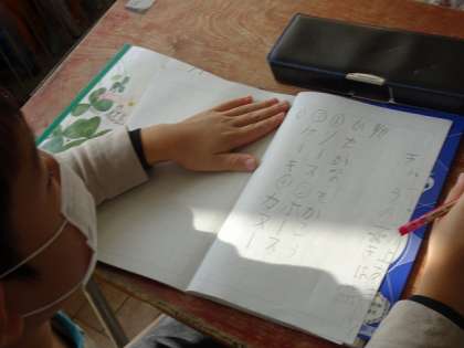 ケーキなど、「ー」が入るカタカナについて、先生が問題を出して、聴き取ってカタカナで書いていました。