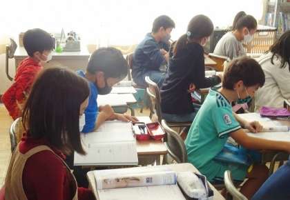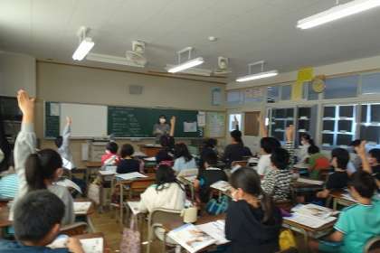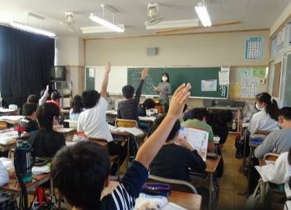 5年生の家庭科の授業では、教科書の写真(散らかった部屋)を見て、物を生かして住みやすくするためには、どうしたらよいかを考えていました。