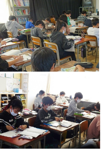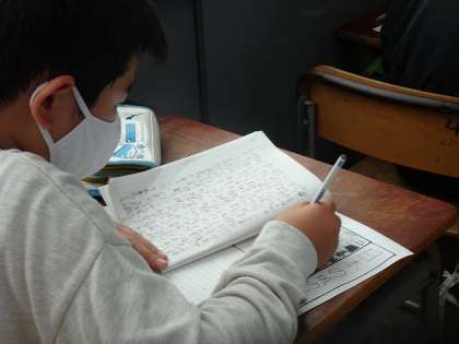 「日本の文化を発信しよう」ということで、一人一人がテーマを持って、調べたことを基に、画用紙の新聞にまとめていました。