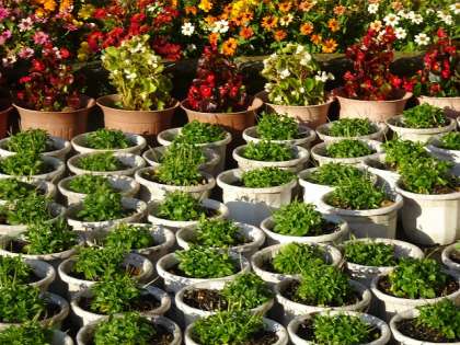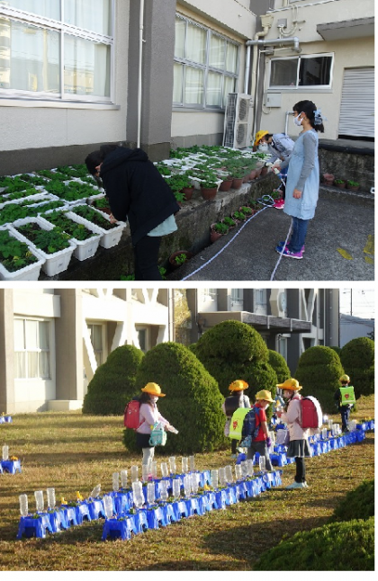 芝生広場では、登校してきた子どもたちが、「パンジー」や「ビオラ」などの花鉢に、水やりをしていました。