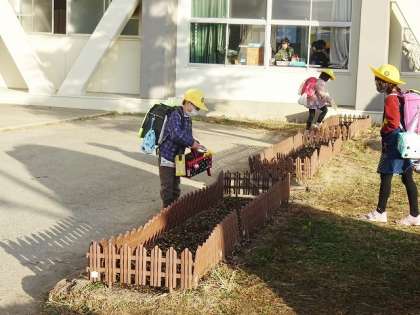 1年生に子どもたちが、「チューリップ」の球根を植えた花だんにも水やりをしていました。