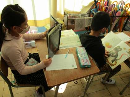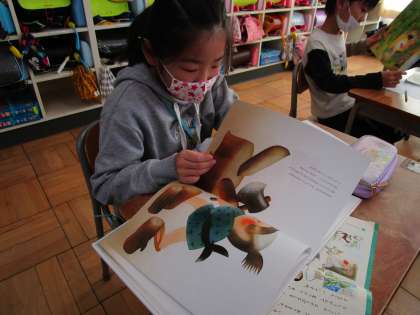 国語は授業で昔話を読みました。本を読んだ後に、自分の読んだ昔話の好きなところや面白かった場面を文で書き表しました。これからも、多くの昔話を読んで、豊かな心を育んでほしいと思います。