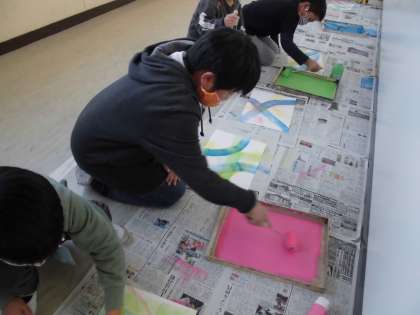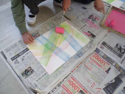 3年生のアートフェスタのテーマは、「あつまれ!新恐竜」です。作品作りの第一弾として、ステンシルローラーで恐竜やそれにまつわるものを作成しています。