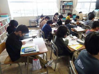 落ち着いた雰囲気の中で、ゴミの処理や環境問題などについて、教科書や資料集を使って、学習していました。