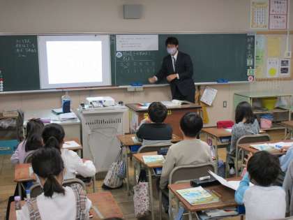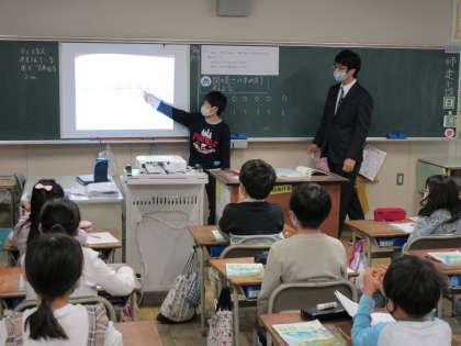 今日は算数の「間の数」の単元で研究授業を行いました。問題文の内容を図を活用して理解し、並んでいる数と間の数の関係やきまりを発見することができました。