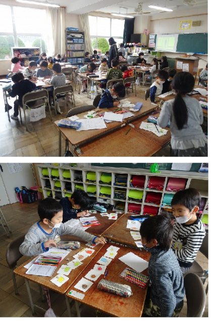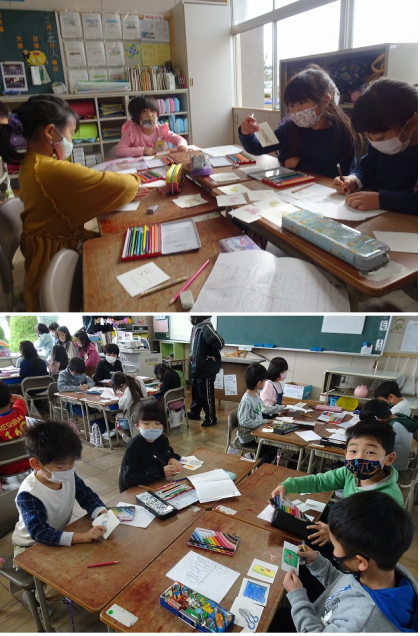 班に分かれて、お菓子、おもちゃ、犬など、それぞれについて、くわしいものを絵に描いたり、プリントに書いたりしていました。