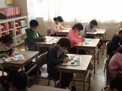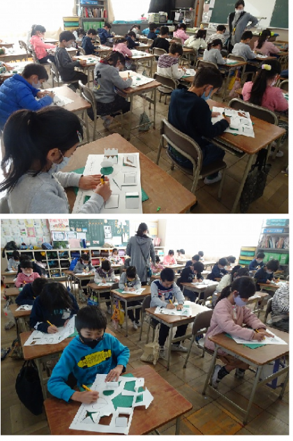 先生の話をよく聞いて、基本的な使い方について、画用紙に書かれた図を、一生懸命に切り抜いていました。