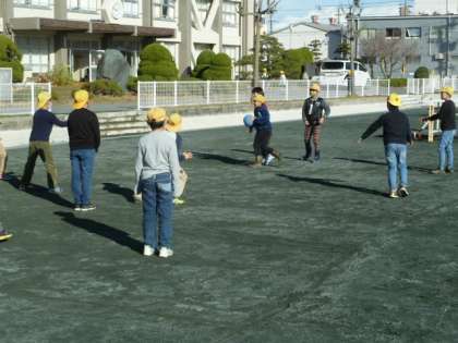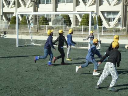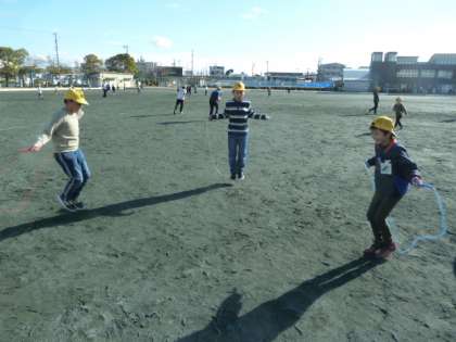 寒風が吹く青空のもと、寒さにも負けずに今日も多くの子どもたちが、外に出て元気よく遊んでいます。体を使って体力作りができていますね。