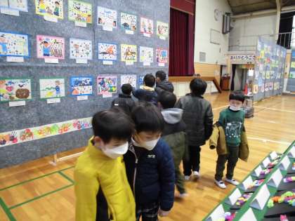 素敵な作品に囲まれて、いい笑顔です。前日には他学年の作品も鑑賞しました。他学年の迫力ある作品に感動しました。