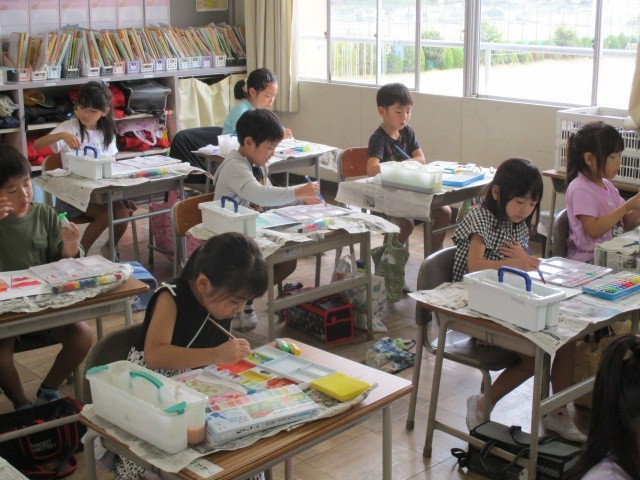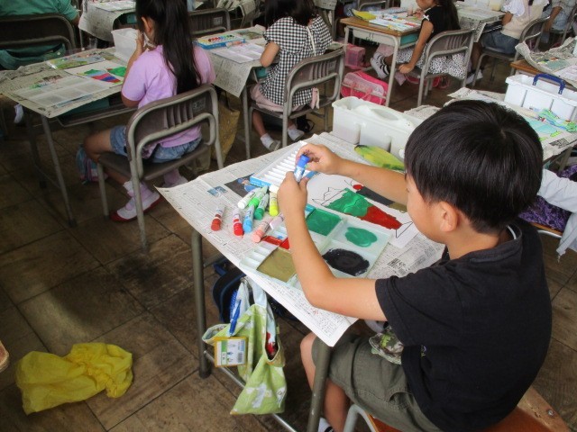 絵の具の使い方の練習でクリームソーダに色付けをしています。