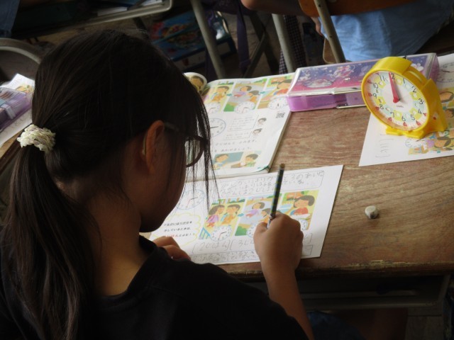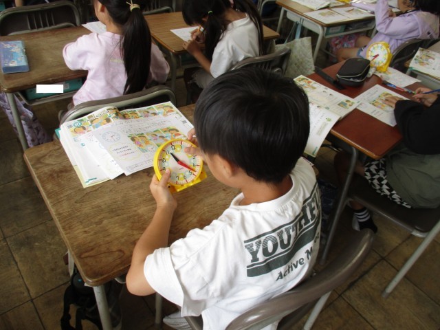 時計の学習が始まりました。何時、何時何分を算数セットの時計を使って考えました。
