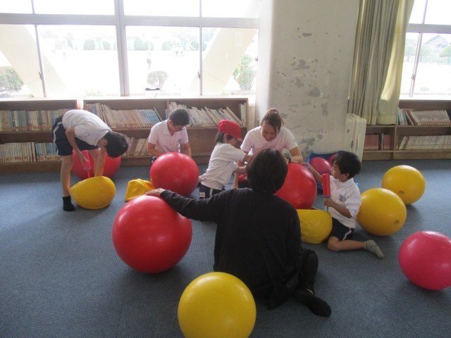 みんな早くやりたくて、ウズウズ・・・準備のため、昼放課から来てくれている先生のお手伝いをしました!たくさんのボールが膨らんだところで、ちょうどチャイムが鳴り、5時間目スタート!